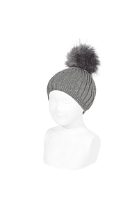 Gorro infantil con mix de canalés 100% algodón con borla pelo.